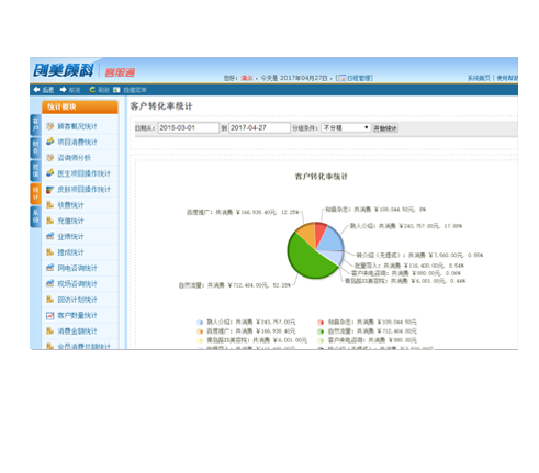 统计报表包括:业绩统计、提成统计、接诊统计、会员卡积分统计、来源的转化率统计,每个环节的转化率统计等。
